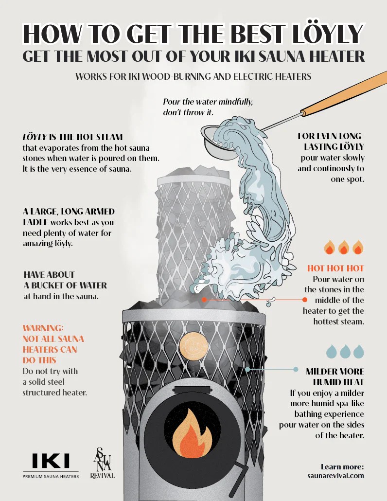 The heating time of an IKI heater is approximately 60-75 minutes to get the sauna stones ready for the appropriate temperature. This can vary depending on the starting temperature and the ventilation of the sauna room. Recommended bathing sauna temperature to enter the saunas with the IKI is approximately 131-175F (55-80C). Then you can increase the temperature of the sauna to a preferred level by poring water to the heater. Pouring water on to the heater increases temperature and humidity of the sauna room. You can control the heat and humidity by pouring water to different parts of the heater. You can adjust the feel of the heat and steam from soft to sharp by pouring water either to the side of the heater or on top of the stones at different places.