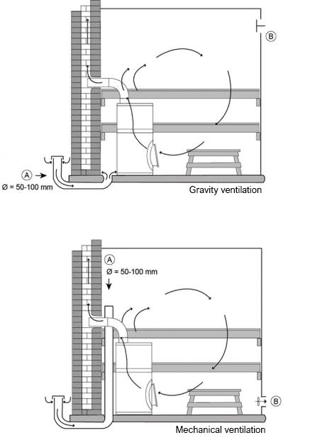 1. We recommend that wood-burning sauna heaters are installed primarily to either a) a brick flue b) a ceramic flue, or c) an air-cooled flue (T600). The suitability of other types of flues must be ensured case by case by conferring with the manufacturer of the flue.
